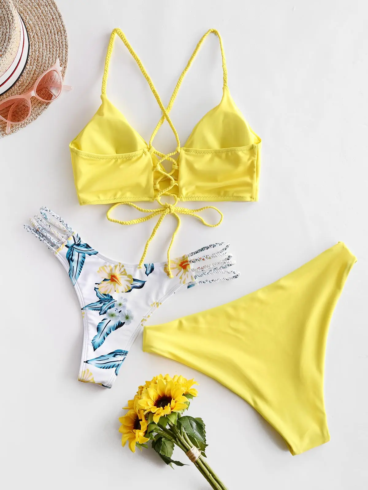 Cheap Offer of ZAFUL Flower Braided Lattice Three Pieces Bikini Swimsuit